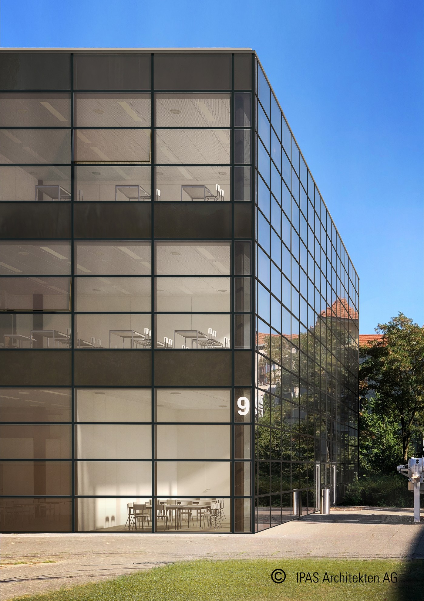 Der denkmalgeschützte Schulhauskomplex BBZ bestehend aus 3 Gebäuden des Architekten Alain G. Tschumi wird Totalsaniert mit Altlastensanierung, Ertüchtigung Primärtragstruktur mit Brandschutz und mit Erdbebensicherheit, Ersatz der Sekundär – und Tertiärstruktur mit Ersatz HLKSE und der Gebäudehülle. Das Gebäude soll zukünftig die Nachhaltigkeitslabel Minergie P / Minergie ECO / SNBS erfüllen. Die Einfachhautfassade SCG / ECG behält ihre Filigranität und Tonalität braun 1: 1 bei. Das Sanierungskonzept wurde maximal optimiert bezüglich Wiederverwendung von Materialien Bestand. Bei der Fassade wird lediglich der Glaskörper modernisiert und die gesamte Unterkonstruktion beibehalten und ertüchtigt. Die Fassade interagiert mit dem hochflexiblen Trennwand – und Metalldeckensystem und garantiert die Grundrissflexibilität. Der Unterhalt der Fassade ist sehr einfach und wenig zeitintensiv. Die Fassade der 2 Schulgebäudekörper inmitten eines begrünten Parkes muss den visuellen und akustischen Kontakt unterstützen für optimale Arbeitsbedingungen. Der Tageslicheintrag soll immer maximal für minimale Nutzung Kunstlicht. Alle Metalldecken werden wiederverwendet und gereinigt für Einbau Akustikvlies und Aktivierung für Heizung und Kühlung. Die Unterlagsböden werden belassen und lediglich der Bodenbelag ersetzt. Das modulare Trennwandsystem muss komplett ersetzt und ergänzt werden für die Anpassungen Brandschutzkonzept. Die Haustechnik wird komplett ersetzt. Der Einsatz von PV Anlagen auf allen Dächern und BI PV Anlagen integriert in den Fassaden wird angestrebt.