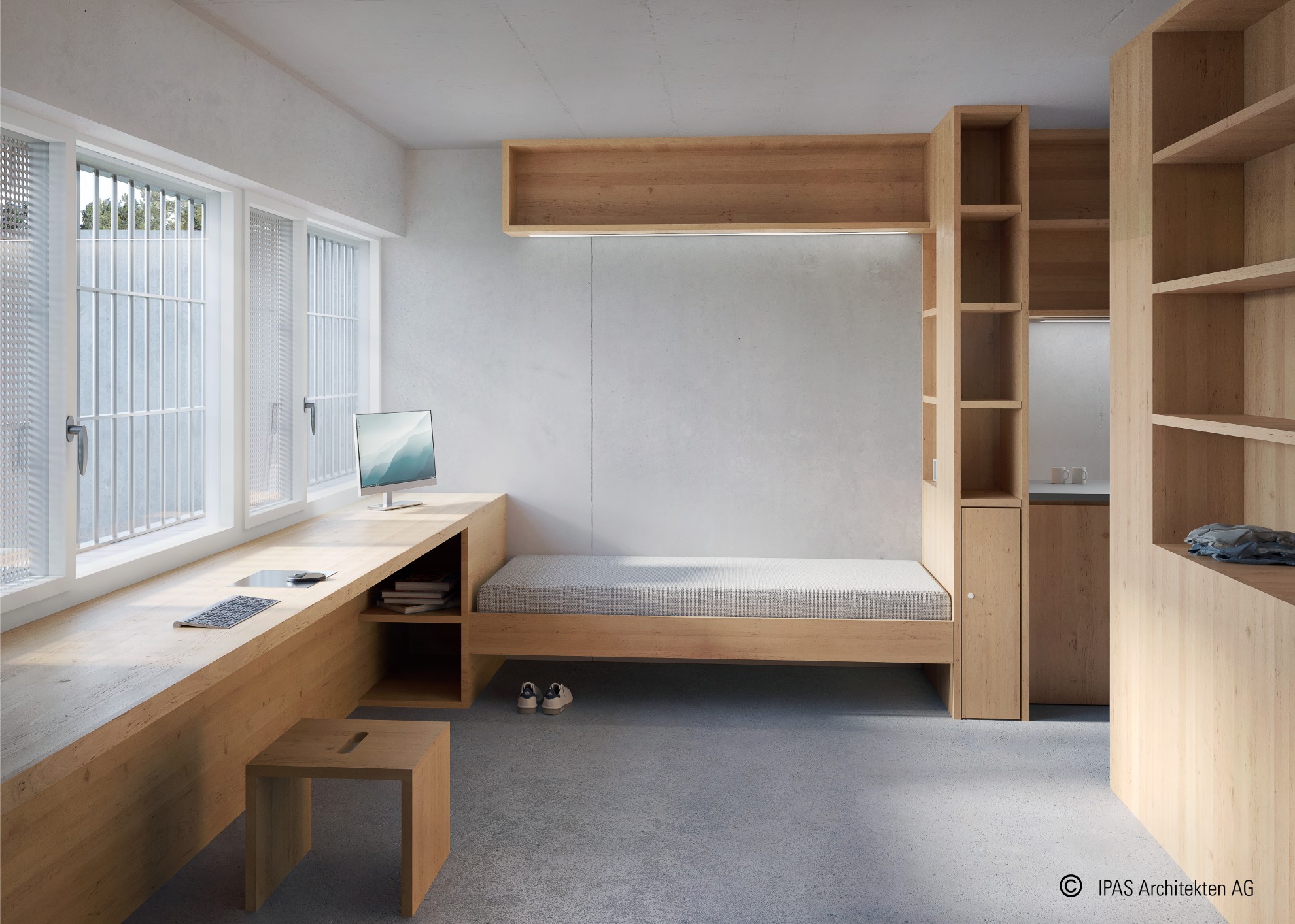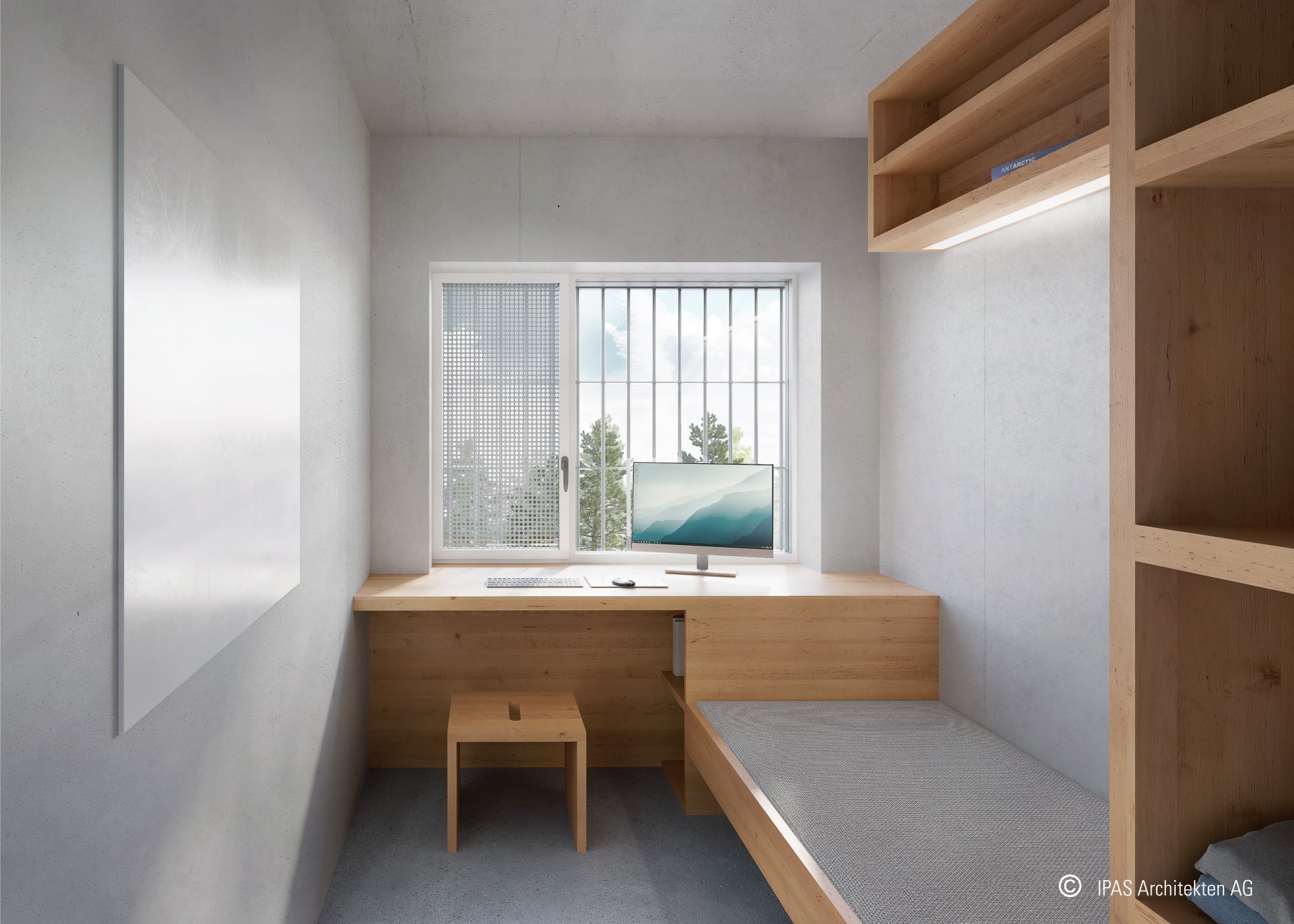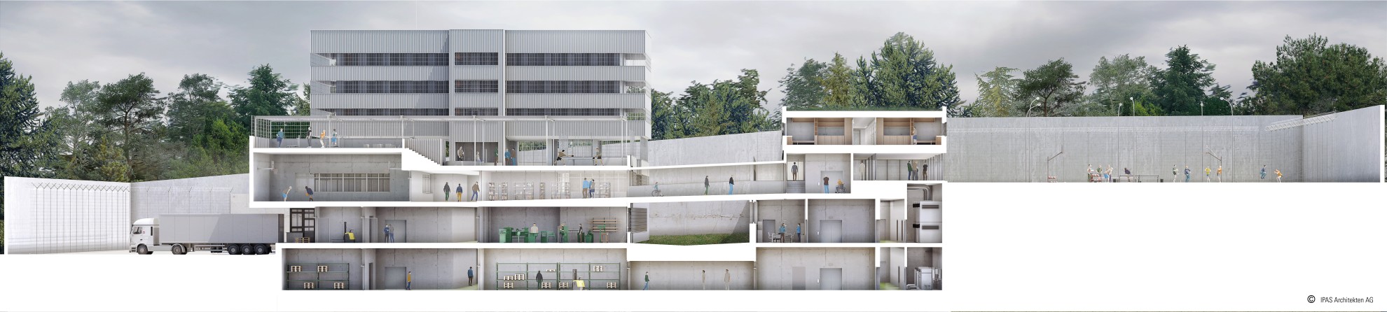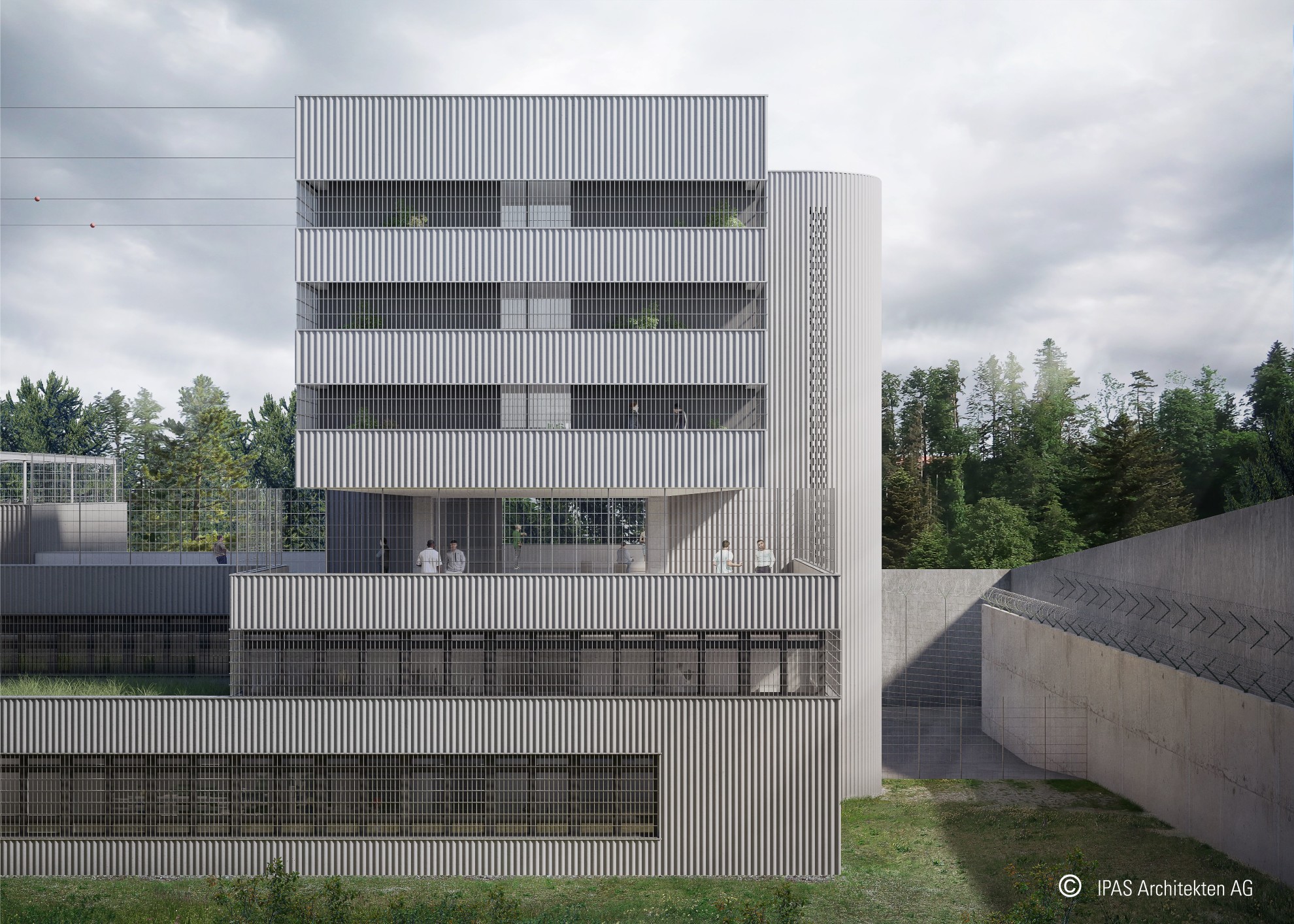Der Neubaubereich umfasst die neue Spezialabteilung für Senioren und Verwahrte. Der Neubau wurde für eine möglichst hohe Flexibilität für die geplanten Vollzugsformen im Spezial-und Normalvollzug konzipiert mit separaten Erschliessungen für maximal 4 getrennte Wohngruppen pro Geschoss. Sport-und Freizeit und Werkstätten befinden sich im EG und können flexibel aus dem Obergeschoss erschlossen werden. Die gesicherte Erschliessung über die Passerelle erlaubt einfache Separierung der Insassengruppen ohne Störung des Spezialvollzugs. Die Arrestzellen sind im OG1 für sich separiert und für den Spezial-und Normalvollzug über Ringerschliessung mit JVA verbunden. Jede Wohngruppe hat ihre eigene gesicherte Terrasse für mehr Flexibilität in der Freizeitorganisation. Die Terrassen ermöglichen einen unbegleiteten Zugang der einzelnen Wohngruppen nach Draussen mit Sicht auf den umgebenden Wald = WALDSICHT. Die Flexibilität des Neubaus erlaubt eine getrennte Nutzung aller Vollzugsformen im Spezial-und Normalvollzug und garantiert die unbegleitete Verschiebung zu Freizeit, zu Werkstätten, zu Besucherräumen, zu Medizinischen Diensten und zu psychologischen Diensten. Die neue Ringerschliessung der Verbindungskorridore im Sockel des Neubaus garantiert die redundante Verbindung aller Insassensektoren, so dass die Verbindungswege Personal verkürzt werden für einfache Interventionen und rasche Entfluchtungen zu den Sammelplätzen. Die neuen Haustechnikräume, Lifte und Treppen sind Bestandteil dieser Ringerschliessung und garantieren einen einfachen Betrieb und Unterhalt.Description:
